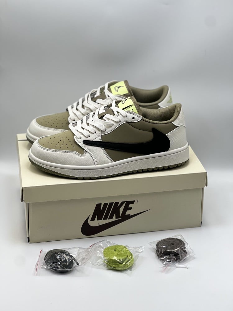 حذاء ترافيس سكوت إكس إير جوردان 1 لو. يتميز الحذاء بجزء علوي مصنوع من مزيج متناغم من الألوان الأخضر والأبيض، مما يعطيه مظهرًا جذابًا وجريئًا. يحتوي الحذاء على تفاصيل مميزة مثل شعار ترافيس سكوت وشعار Air Jordan على اللسان والكعب.